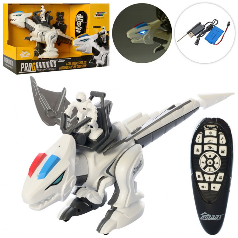 Радиоуправляемый Динозавр с наездником - это интерактивный динозавр приведет в восторг не только ребенка, но и заставит удивиться большинство взрослых. Маленький белый робот установлен на сиденье и управляет динозавром. Игрушка управляется с помощью голосовых функций и дистанционного пульта, умеет двигаться вперед, назад, поворачиваться вправо и влево, танцевать под музыку, общается с помощью записанных команд. Во время движения и при выполнении движений глаза светятся.